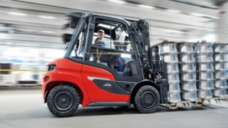 Der niedrige Fahrzeugschwerpunkt und die hochmontierte Lenkachse verbessern die Stabilität der Fahrzeuge und sorgen für eine hohe Kippsicherheit. Unterstützend greift in Kurven das Linde MH Sicherheitsassistenzsystem „Linde Curve Assist“ ein und reduziert bei Kurvenfahrten automatisch und proportional die Fahrgeschwindigkeit. Ein verschleißfreies und ausfallsicheres Bremssystem garantiert, dass das Fahrzeug immer sicher zum Stehen gebracht wird.