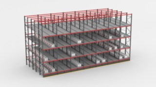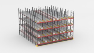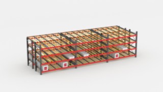 Beim Einschubregal werden die Paletten nur von einer Seite in einen Regalkanal eingeschoben und dort auch wieder entnommen. Dafür werden die Paletten auf Rollenbahnen abgesetzt, die sich leicht zum Regalende neigen. Wird eine neue Palette in den Kanal geschoben, rücken schon eingelagerte Waren nach hinten. Einschubregale bieten pro Kanal Platz für zwei bis sechs Paletten und nutzen den verfügbaren Raum 75 Prozent besser als klassische Palettenregale. Sie eignen sich als Bereitstellungsregal oder für größere Lagermengen des gleichen Artikels, die nach dem Lifo-Prinzip (Last in, first out) gelagert werden können.