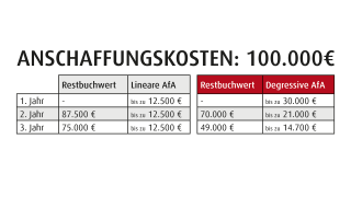 Beispielrechnung: Vergleich von Linearer AfA (12,5%) zu Degressiver AfA (30%)