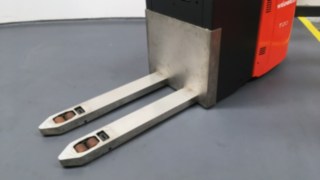 Unser Edelstahlüberzug für die Gabelzinken hat ein sehr geringes Aufbaumaß durch eine maximale Blechdicke von 3,00 mm und ist geeignet für Einsatzbereiche, in denen keine Lackabplatzer auf der Gabelzinkenoberseite auftreten dürfen, und zur Aufnahme von Ladungsträgern aus Edelstahl, z.B. von Edelstahlcontainern. Der hochwertige Überzug aus Edelstahl 1.4301 wird sicher mit den Gabelzinken, bzw. dem Fahrzeug verschweist. Je nach Fahrzeug wird außerdem ein Edelstahlüberzug des Batteriekastens bzw. Gabelträgers vorgenommen.